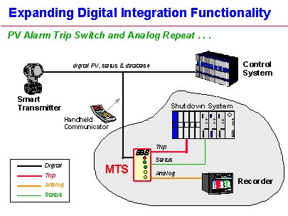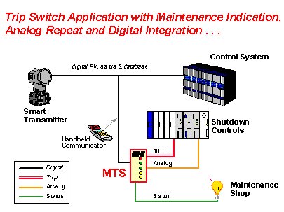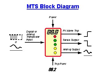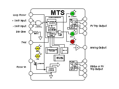 The MTS accepts a digital signal from the transmitter and provides a HIGH or LOW PV alarm trip. The PV trip point is